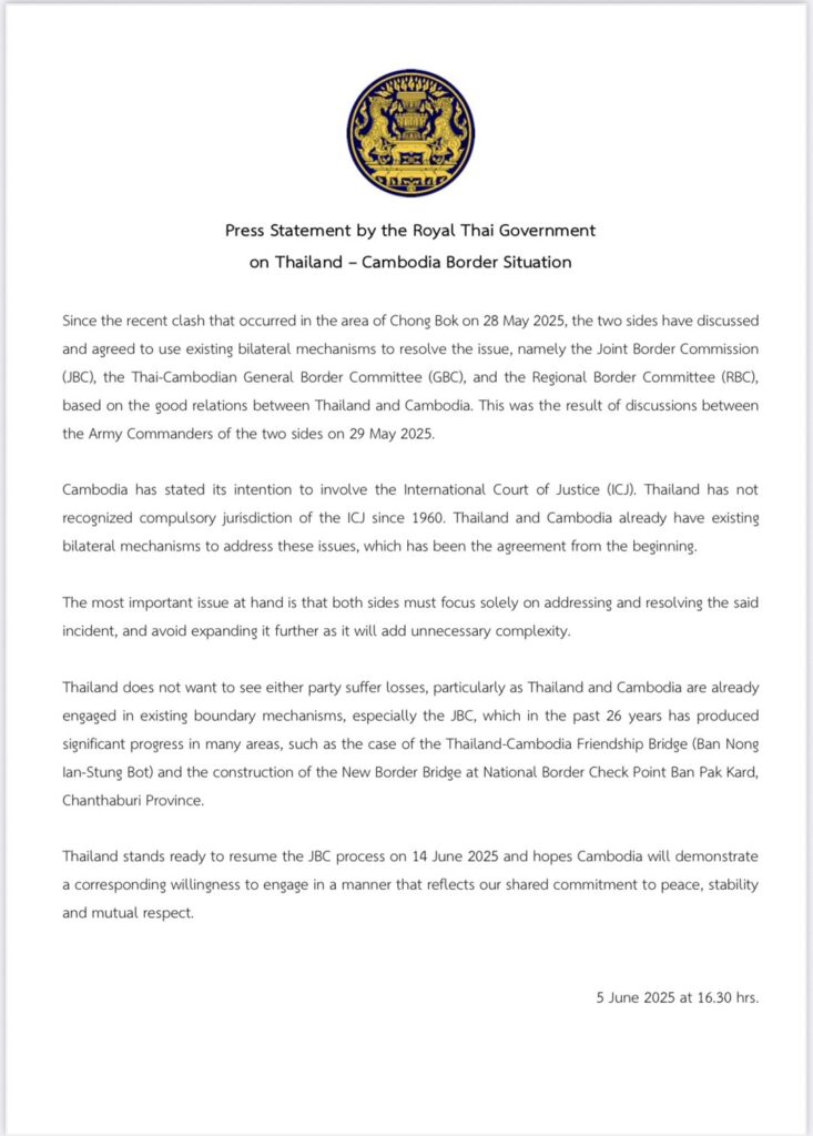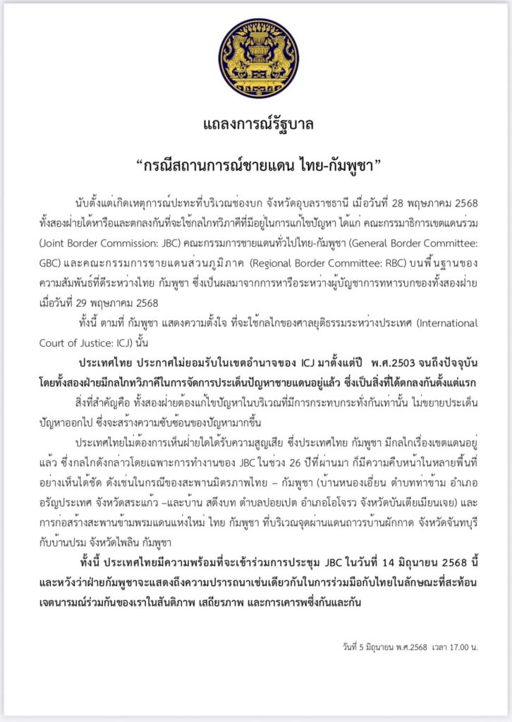ต่อมาเวลา 17.00 น.วันที่5 มิ.ย.นายจิรายุ ห่วงทรัพย์ โฆษกประจำสำนักนายกรัฐมนตรี กล่าวว่า ภายหลังเกิดเหตุการณ์ที่บริเวณชายแดนไทย -กัมพูชา เมื่อวันที่ 28 พ.ค. 2568 ที่ผ่านมา รัฐบาลได้ออกแถลงการณ์กรณีดังกล่าวเป็นฉบับที่ 2 ข้อความว่า