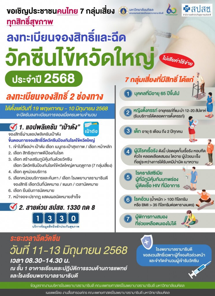 คณะแพทยศาสตร์โรงพยาบาลรามาธิบดี ขอเชิญประชาชนคนไทย 7 กลุ่มเสี่ยง ทุกสิทธิ์สุขภาพ ลงทะเบียนจองสิทธิ์และฉีดวัคซีนไข้หวัดใหญ่ประจำปี 2568 ไม่เสียค่าใช้จ่าย