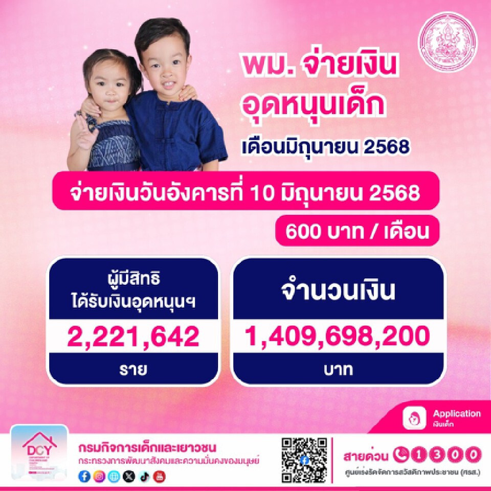 พม.-กรมบัญชีกลาง จ่ายเงินให้ผู้มีสิทธิรับเงินอุดหนุนบุตรเดือนมิถุนายน 2568