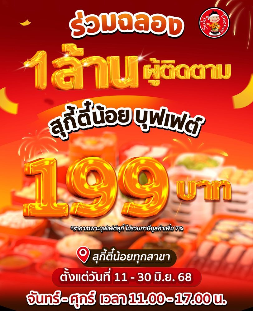 โดยเพจ สุกี้ตี้น้อย ยังระบุเพิ่มเติมว่า ตี๋น้อย ขอขอบคุณ FC ทุกท่าน ที่ช่วยกดติดตามเพจสุกี้ตี๋น้อย ครบ 1,000,000 โปรฯ เรียกน้ำย่อย โปรแรก พี่เฟิร์นบอกกับตี๋น้อยว่า ปีนี้ทั้งปี จัดหนัก จัดเต็ม ตลอดปี 2568 ราคา 199 บาท (ยังไม่รวมเครื่องดื่มและภาษีมูลค่าเพิ่ม) ตั้งแต่วันที่ 11 – 30 มิ.ย. 68 เฉพาะวันจันทร์-วันศุกร์ เวลา 11.00-17.00 น.