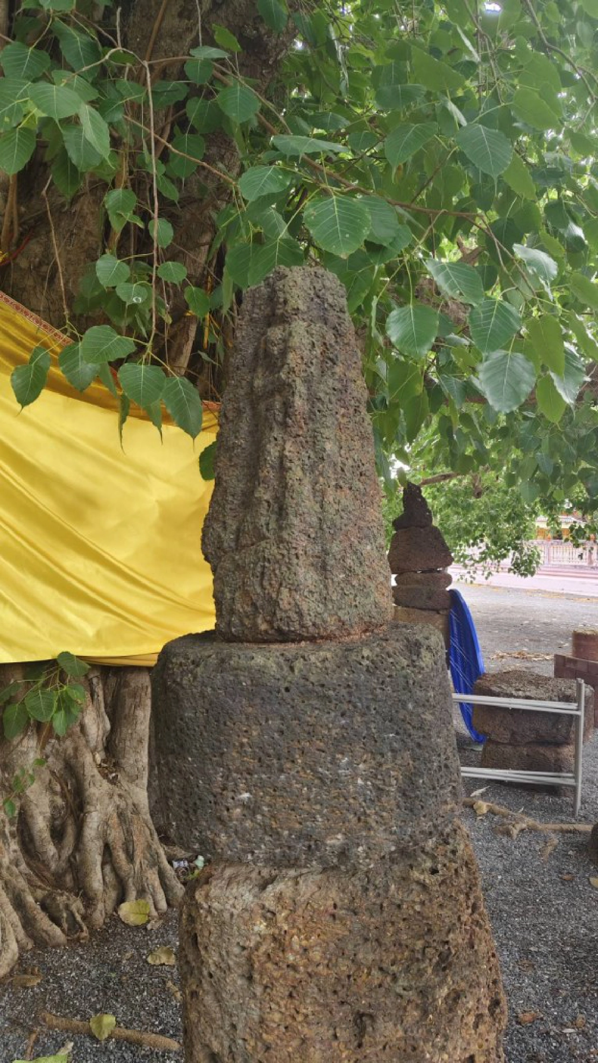 โดยภายในเจดีย์หลวงพ่ออิฐจะมีผ้าเหลืองคลุมบริเวณรอบเจดีย์ ทั้งยังมีต้นโพธิ์ขนาดใหญ่ขึ้นปกคลุมเป็นร่มเงา จากการตรวจสอบยังพบว่าบริเวณรอบต้นโพธิ์มีหินศิลาแลงลักษณะเป็นวงกลมสี่ก้อน ตั้งเรียงกันเป็นเสาอยู่กับพื้นดินความสูงโดยประมาณ 165 ซม. ส่วนบริเวณหินศิลาแลงด้านบนสุด มีลักษณะสามเหลี่ยมคล้ายใบโพธิ์อยู่รอบทิศทั้งหมด 4 เสา ซึ่งหินศิลาแลงที่เป็นรูปสามเหลี่ยมลักษณะคล้ายใบโพธิ์นั้น มีร่องสลักเจาะเป็นรูวงกลมความกว้างประมาณ 5-10 เซนติเมตร อยู่บริเวณด้านหลังเหมือนกับเป็นรูที่ใช้สำหรับปักธงหรือปักกลด ทั้งหมด 4 เสาอย่างที่กล่าวมา