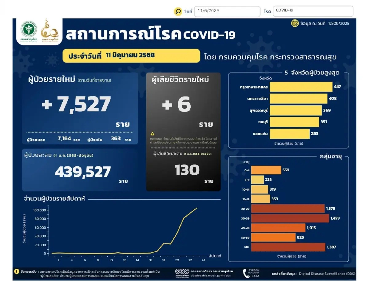 12 มิถุนายน 2568 กรมควบคุมโรค กระทรวงสาธารณสุข รายงานสถานการณ์โรคโควิด-19 ประจำวันที่ 11 มิถุนายน 2568 โดยพบว่า ยอดผู้ติดเชื้อรายใหม่ทั่วประเทศเพิ่มขึ้นถึง 7,527 ราย ขณะที่ยอดผู้เสียชีวิตเพิ่มอีก 6 ราย ส่งผลให้ ยอดสะสมผู้ป่วยตั้งแต่ต้นปี (1 ม.ค. – ปัจจุบัน) อยู่ที่ 439,527 ราย และผู้เสียชีวิตสะสมเพิ่มเป็น 130 ราย
