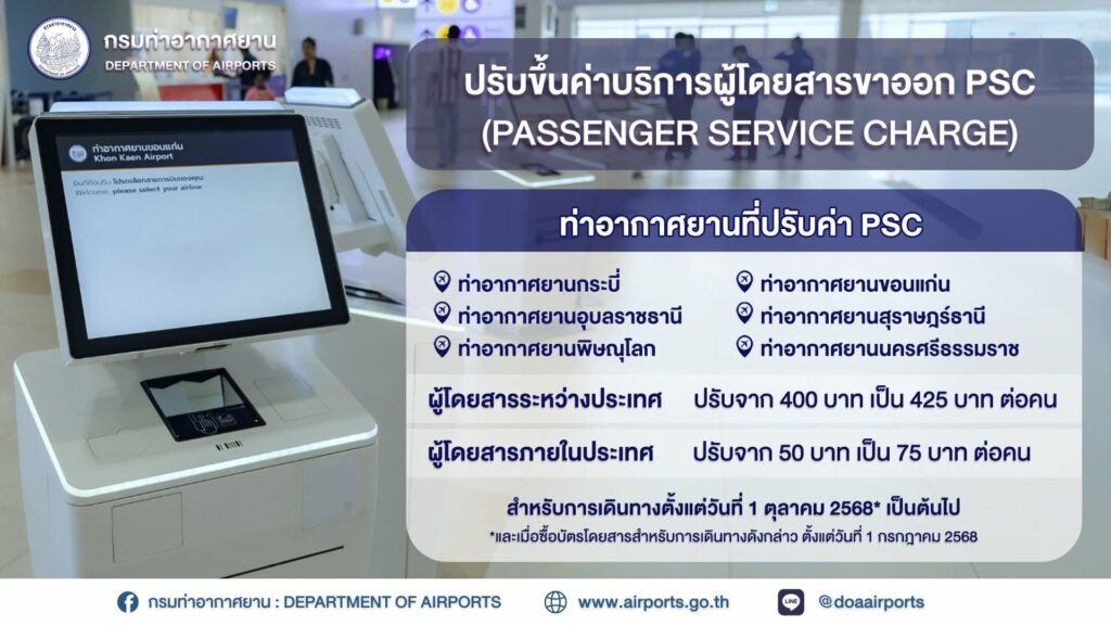 กรมท่าอากาศยาน แจ้งปรับขึ้นค่าบริการผู้โดยสารขาออก (Passenger Service Charge: PSC) 6 ท่าอากาศยานในสังกัด ได้แก่ ท่าอากาศยานกระบี่ สุราษฎร์ธานี อุบลราชธานี ขอนแก่น นครศรีธรรมราช และพิษณุโลก สำหรับการเดินทางวันที่ 1 ต.ค.เป็นต้นไป เมื่อซื้อบัตรโดยสารตั้งแต่ 1 ก.ค.เป็นต้นไป