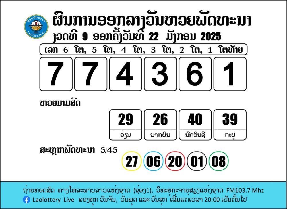 ที่มา: ตรวจหวยลาววันนี้ งวดประจำวันพุธที่ 22 มกราคม 2568 - บ้านกีฬา (bankeela.com)