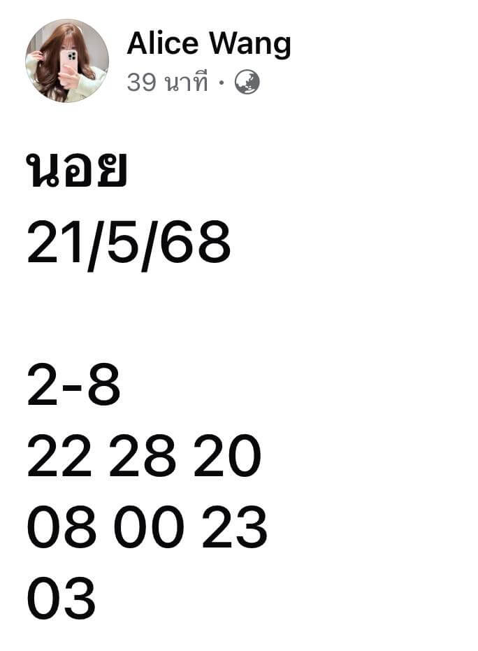 ตัวเด่นจาก Alice Wang คือ 22 – 28 – 00 – 03 ที่ตรงกับเลขเด่นของสำนักอื่นด้วย จึงควรพิจารณาอย่างจริงจัง