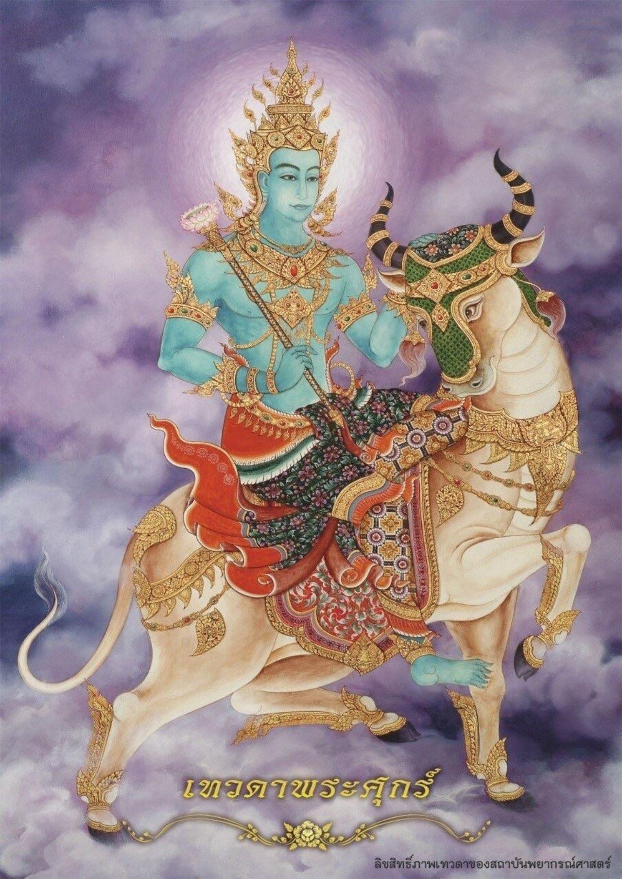 พระอิศวรทรงสร้างจากโค 21 ตัว บดป่นเป็นผง ห่อด้วยผ้าสีฟ้าอ่อน พรมด้วยน้ำอมฤตเป็นพระศุกร์ มีผิวกายสีฟ้า ทรงโคเป็นพาหนะ ประจำอยู่ทิศเหนือ เป็นเทพนพเคราะห์ประเภทศุภเคราะห์ กิริยาน่ารัก อ่อนหวาน ชอบงานศิลปะทุกประเภท เป็นมิตรกับพระอังคารและเป็นศัตรูกับพระเสาร์ สัญลักษณ์เลข 6 มีกำลังพระเคราะห์เป็น 21 พระศุกร์เป็นครูของเหล่ายักษ์
