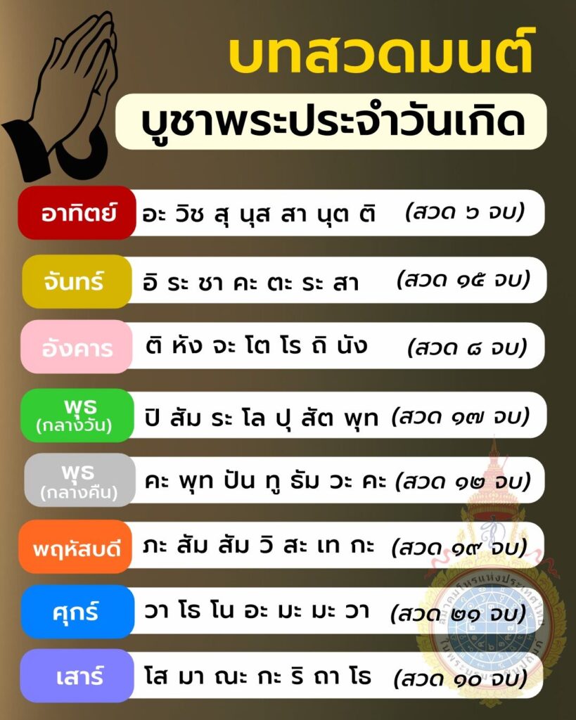สมาคมโหรแห่งประเทศไทยฯ ได้เผยแพร่ บทสวดมนต์บูชาพระประจำวันเกิดทั้ง 7 วัน สำหรับสวดก่อนนอนตามกำลังวัน เพื่อเสริมสิริมงคลให้แก่ชีวิต ไว้ดังนี้