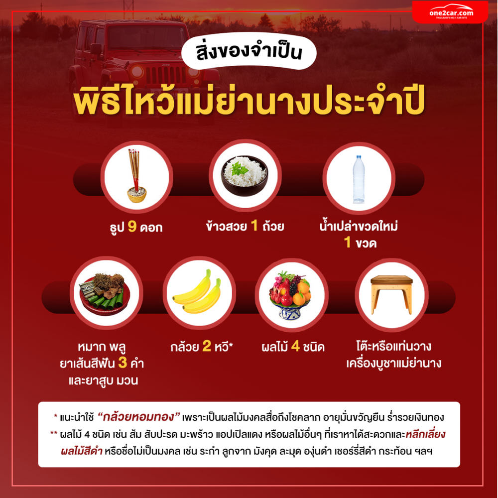 พิธีเจิมรถและพิธีไหว้แม่ย่านางประจำปี เป็นสิ่งที่อยู่คู่คนไทยมาอย่างยาวนานเพื่อความเป็นสิริมงคลแก่ชีวิต ค้าขายร่ำรวย แคล้วคลาดปลอดภัย หรือเรียกขวัญกำลังใจให้ผู้ขับขี่ ซึ่งบางคนอาจเช็กเรื่องฤกษ์ออกรถ เลขทะเบียนรถมงคล แม้กระทั่งสีรถถูกโฉลกตามวันเกิดด้วยเช่นกัน