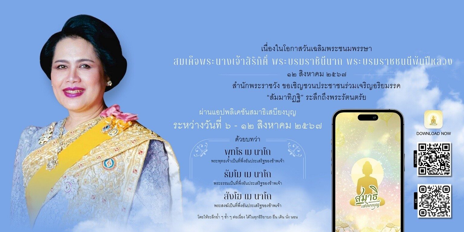 เมื่อวันที่ 5 สิงหาคม สำนักพระราชวัง ขอเชิญชวนประชาชนร่วมเจริญอริยมรรค “สัมมาทิฏฐิ” ระลึกถึงพระรัตนตรัย ว่าเป็นสรณะที่พึ่งที่ยึดถือ อันเป็นทางเป็นธรรมที่พระพุทธองค์ได้ตรัสไว้โดยชอบ เพื่อถวายเป็นพระราชกุศล แด่สมเด็จพระนางเจ้าสิริกิติ์ พระบรมราชินีนาถ พระบรมราชชนนีพันปีหลวง เนื่องในโอกาสวันเฉลิมพระชนมพรรษา 12 สิงหาคม 2567 ผ่านแอปพลิเคชัน “สมาธิเสบียงบุญ” ระหว่างวันที่ 6 – วันที่ 12 สิงหาคม