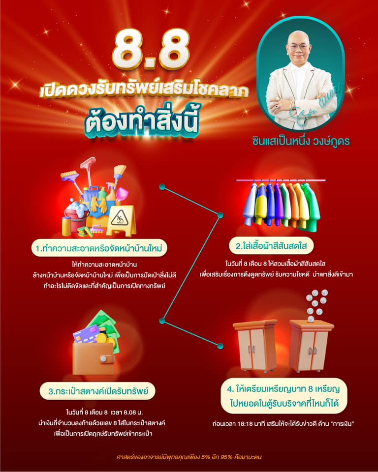 ซินแสเป็นหนึ่ง แนะทำ 4 ข้อ 8.8 เปิดดวงรับทรัพย์เสริมโชคลาภ จะได้รับข่าวดีด้านการเงิน เปิดทางทรัพย์ ปัดเป่าสิ่งไม่ดี ทำอะไรไม่ติดขัด
