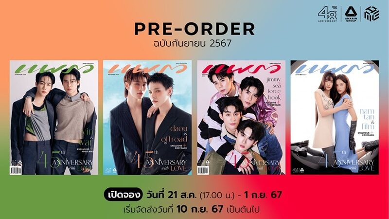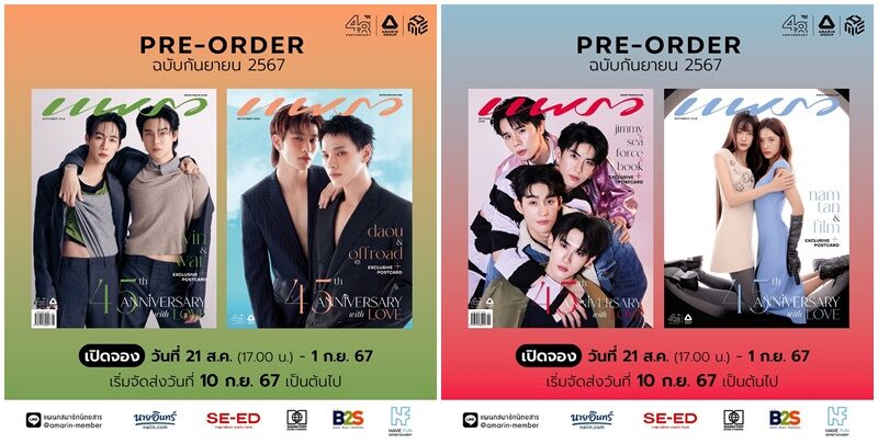 เดือนเกิดทั้งทีจะธรรมดาได้ยังไง โดยเฉพาะนิตยสารแพรวฉบับพิเศษ เดือนกันยายน 2024 เล่มนี้เหล่าแฟนคลับห้ามพลาดต้องมีเก็บสะสม เพราะมา ในรูปแบบ 2 เวอร์ชั่น 4 ปก โดยคว้า 10 คนดังจาก “จักรวาลซีรีส์วายไทย” หยิ่น อานันท์ & วอร์ วนรัตน์ / ต้าห์อู๋ พิทยา & ออฟโรด กันตภณ / จิมมี่ จิตรพล & ซี ทวินันท์ กับ ฟอส จิรัชพงศ์ & บุ๊ค กษิดิ์เดช / น้ำตาล ทิพนารี & ฟิล์ม รชานันท์ มาร่วมถ่ายแฟชั่นเฉลิมฉลองพร้อมบทสัมภาษณ์สุดเอ็กซ์คลูซีฟ ซึ่งเปิดให้พรีออเดอร์แล้วตั้งแต่วันนี้ถึง 1 กันยายน 2024 ที่ร้านนายอินทร์ทุกสาขา และร้านหนังสือชั้นนำทั่วไป