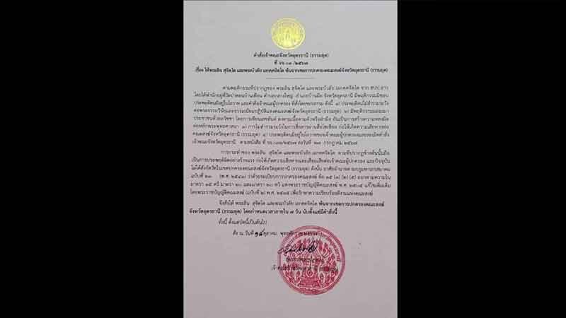 โดยในคำสั่งดังกล่าวมีข้อความว่า ตามพฤติกรรมที่ปรากฎของ พระลิน สุจิตโต และพระบัวลัย เอกคคจิตโต จาก สปป.ลาว โดยได้พำนักอยู่ที่วัดปาดอนบ้านเทือน ต.กลางใหญ่ อ.บ้านผือ จ.อุดรธานี มีพฤติกรรมมิชอบ ประพฤติตนมิอยู่ในโอวาท และคำสั่งเจ้าคณะผู้ปกครอง ที่สั่งโดยชอบธรรม ดังนี้ 1) ประพฤติตนไม่สำรวมระวังต่อพระธรรมวินัยและธรรมเนียมปฏิบัติแห่งคณะสงฆ์จังหวัดอุดรธานี (ธรรมยุต) 2) มีพฤติกรรมมอมเมาประชาชนด้วยอวิชชา