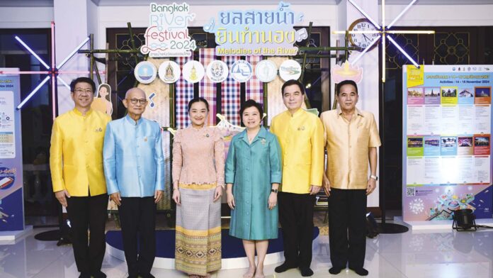 โดยมี น.ส.สุดาวรรณ หวังศุภกิจโกศล รมว.วัฒนธรรม เป็นประธานในพิธีแถลงข่าวการจัดงาน “River Festival 2024 สายน้ำแห่งวัฒนธรรมไทย” พร้อมด้วย นายสุรพล เศวตเศรนี ประธานการจัดงาน River Festival 2024 สายน้ำแห่งวัฒนธรรมไทย และนายนิติกร กรัยวิเชียร ผอ.โครงการส่งเสริมศิลปวัฒนธรรม บริษัท ไทยเบฟเวอเรจ จำกัด (มหาชน) ในฐานะผู้สนับสนุนหลักการจัดงาน ร่วมด้วย กองทัพเรือ กรุงเทพมหานคร การท่องเที่ยวแห่งประเทศไทย และภาคีเครือข่ายทุกภาคส่วน ณ อาคารสิริภักดีธรรม วัดประยุรวงศาวาสวรวิหาร