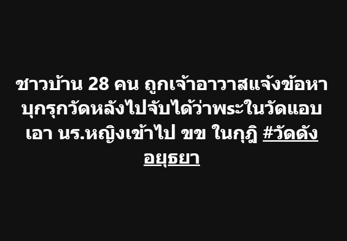 ที่มา :เจ้าอาวาส ยืนยัน ฟ้องชาวบ้าน 28 คน ข้อหาบุกรุก-หมิ่นประมาท หลังเพจดังแฉ พระเอาผญ.ขึ้นกุฏิ