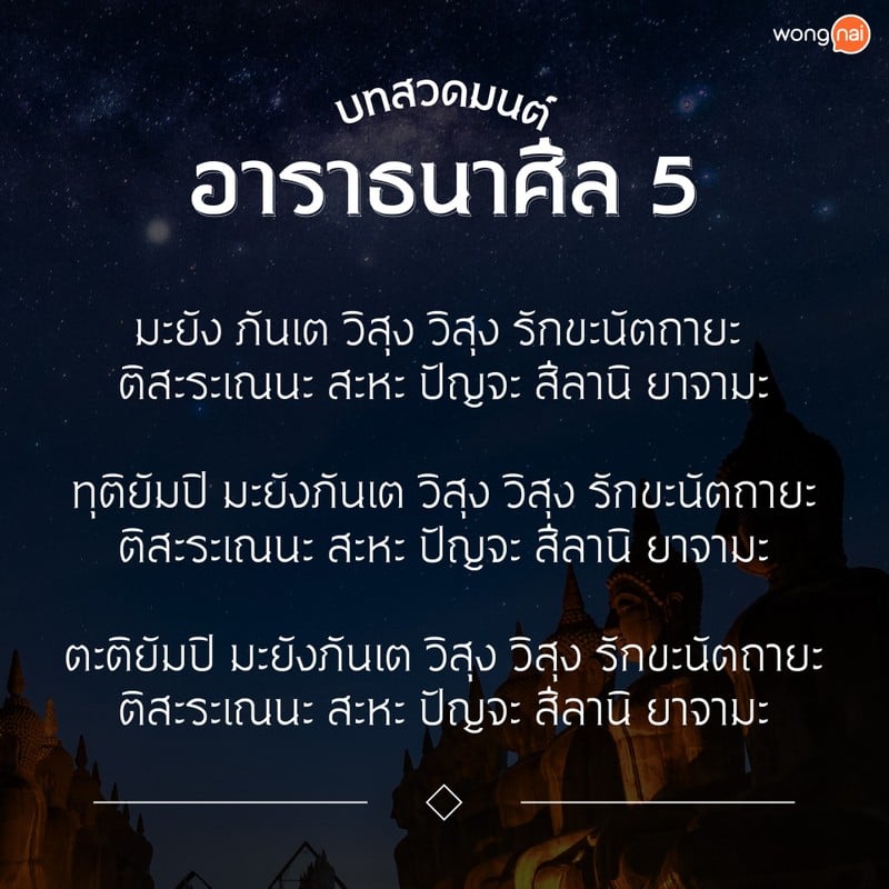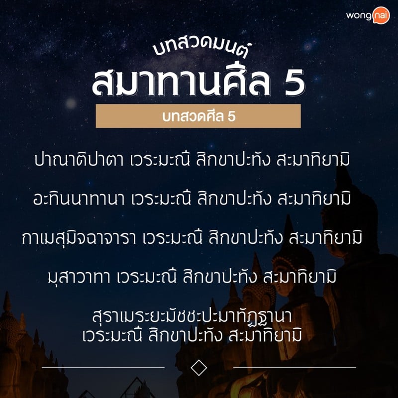 บทสวดพื้นฐานของความเป็นมนุษย์ ทุกคนควรมีศีล 5 ในใจ จะทำให้เราไม่เบียดเบียนผู้อื่น ไม่ประพฤติผิดศีลธรรม กรรมชั่วก็จะเกิดได้ยาก รักษาศีลเท่ากับรักษาตัว