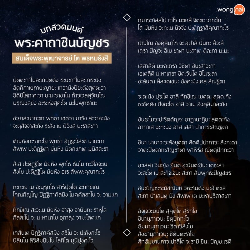 การ “สวดมนต์ก่อนนอน” ทำให้ร่างกายเกิดสารสื่อประสาทสมดุล ช่วยให้จิตใจสงบ มีสติ ใจเย็น สามารถพิจารณาเรื่องต่าง ๆ ได้อย่างละเอียดและรอบคอบ อีกทั้งยังช่วยให้นอนหลับสบาย ตื่นเช้ามาแล้วรู้สึกสดชื่น เป็นวิธีที่ทุกคนทำได้ง่าย ๆ แถมในทางพระพุทธศาสนา ยังเป็นการระลึกถึงพระพุทธ พระธรรม พระสงฆ์ และสิ่งดี ๆ อันเป็นกุศล นำไปสู่ศีล สมาธิ และปัญญาในการดำเนินชีวิต วันนี้ Wongnai จึงได้รวบรวมบทสวดมนต์ก่อนนอนดี ๆ มาฝากทุกคน เพื่อจะได้นำไปสวดมนต์ไหว้พระ ปฏิบัติสมาธิ และเจริญสติกันค่ะ