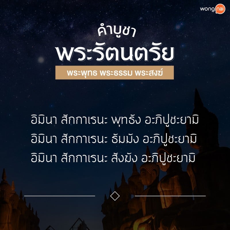 *ก่อนเริ่มต้นสวดมนต์ไหว้พระ ให้ทุกคนน้อมระลึกถึงพระรัตนตรัยกราบบูชาพระพุทธ พระธรรม และพระสงฆ์ ก่อน แล้วจึงค่อยเริ่มกล่าวบทสวดมนต์อื่น ๆ ตามปกติ