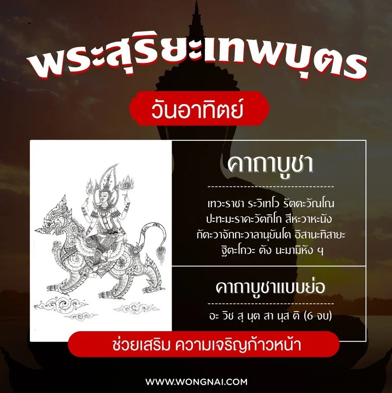 บทสวดมนต์ : เทวะราชา ระวิเทโว รัตตะวัณโณ ปะทะมะราคะวัตถิโก สีหะวาหะนัง กัตะวาจักกะวาลานุยันโต อิสานะทิสายะ ฐิตะโกวะ ตัง นะมามิหัง ฯ