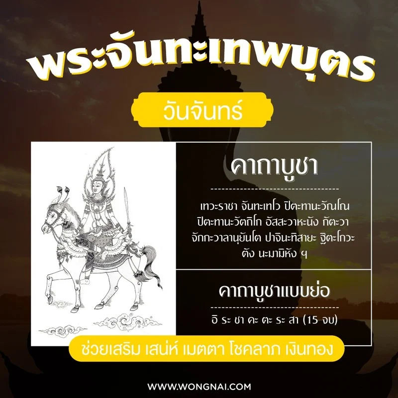 บทสวดมนต์ : เทวะราชา จันทะเทโว ปิตะทานะวัณโณ ปิตะทานะวัตถิโก อัสสะวาหะนัง กัตะวา จักกะวาลานุยันโต ปาจินะทิสายะ ฐิตะโกวะ ตัง นะมามิหัง ฯ