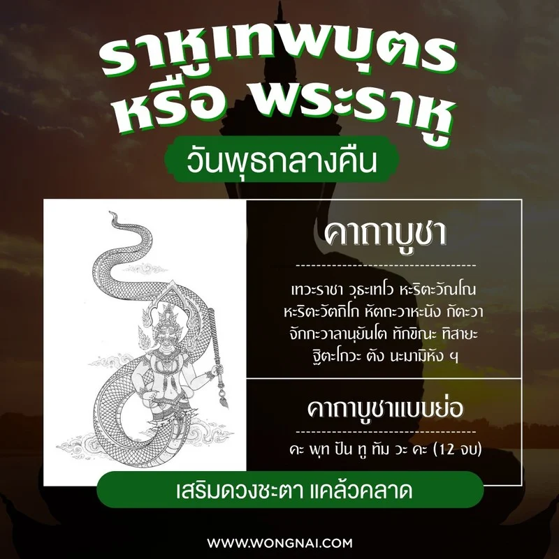 บทสวดมนต์ : เทวะราชา อะสุรินทะราหู กาฬะวัณโณ สุวัณณาภะระณิโก สุปัณณะวาหะนัง กัตะวา จักกะวาลานุยันโต วายะวะทิสายะ ฐิตะโกวะ ตัง นะมามิหัง ฯ