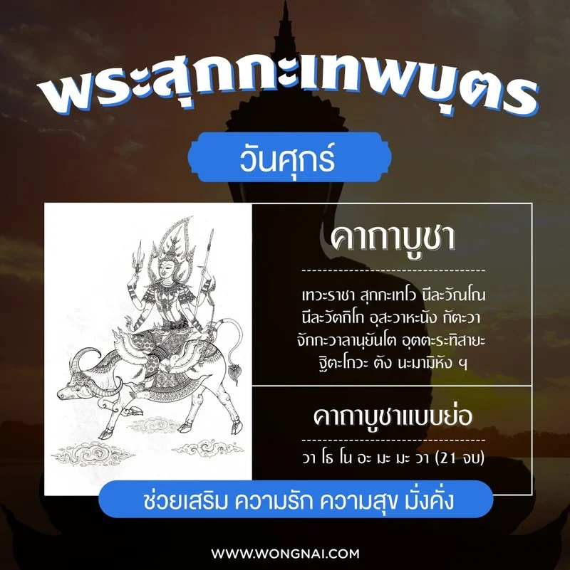 บทสวดมนต์ : เทวะราชา สุกกะเทโว นีละวัณโณ นีละวัตถิโก อุสะวาหะนัง กัตะวา จักกะวาลานุยันโต อุตตะระทิสายะ ฐิตะโกวะ ตัง นะมามิหัง ฯ
