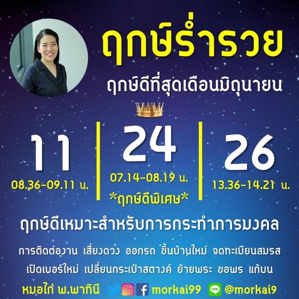 ที่มา : 3 ฤกษ์ร่ำรวยเดือนมิถุนายน หมอไก่ พ.พาทินี (thairath.co.th)