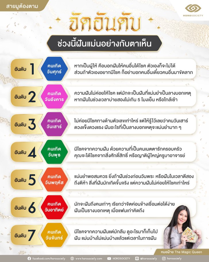 สายมูต้องตาม!! HOROSOCIETY โดย หมอฝ้าย The Magic Queen จัดอันดับคนเกิดทั้ง 7 วัน ใครที่ช่วงนี้ฝันแม่นอย่างกับตาเห็นมากที่สุด
