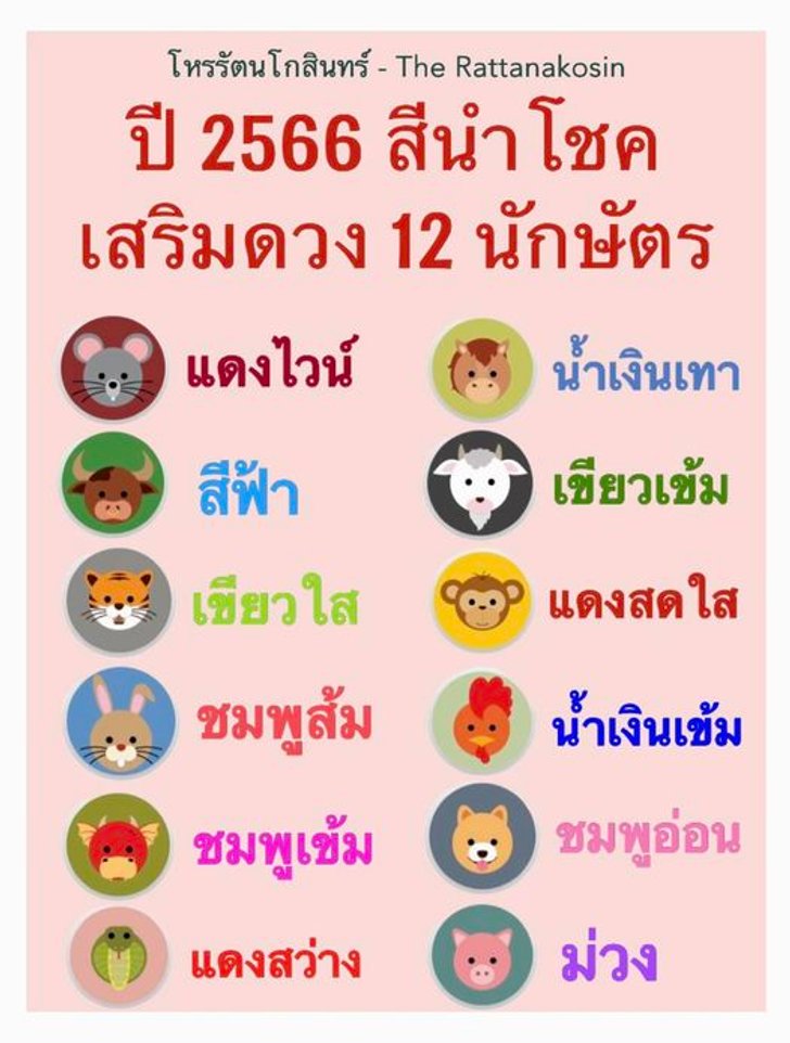 ที่มา : สีนำโชคเสริมดวง 12 นักษัตร ปี 2566 โดย โหรรัตนโกสินทร์ (sanook.com)