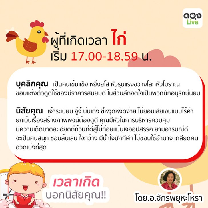 ผู้ที่เกิดเวลา ไก่ เริ่ม 17.00 - 18.59 น.