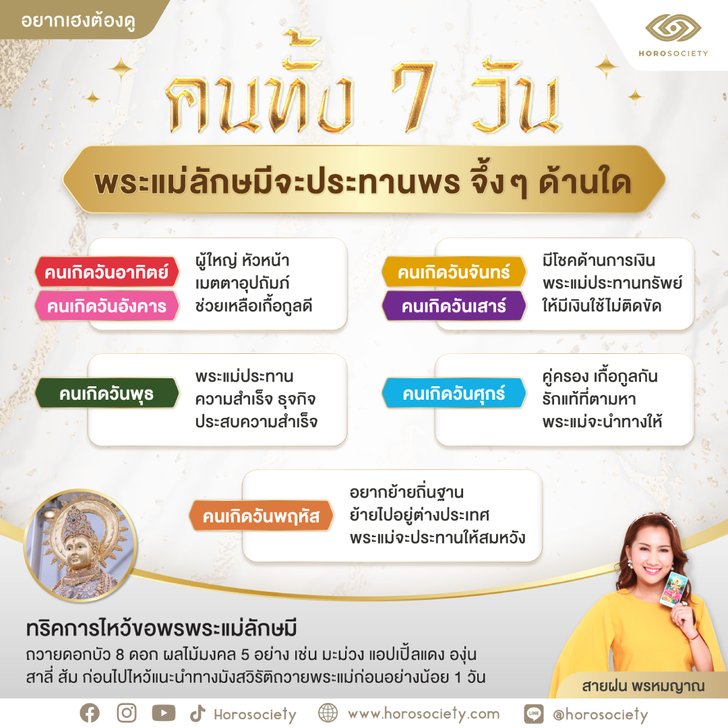 สายฝน พรหมญาณ ทำนายทายทักถึงดวงชะตาคนเกิดทั้ง 7 วัน มาดูกันว่าพระแม่ลักษมีจะประทานพร จึ้งๆ ด้านใดแก่แต่ละคนบ้าง