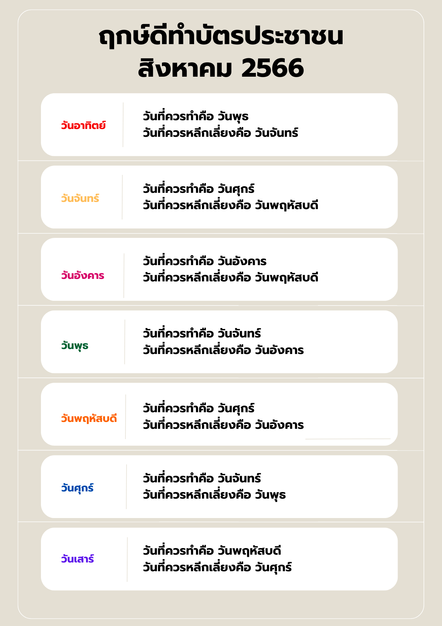 - วันอาทิตย์ : วันที่ควรทำคือ วันพุธ วันที่ควรหลีกเลี่ยงคือ วันจันทร์