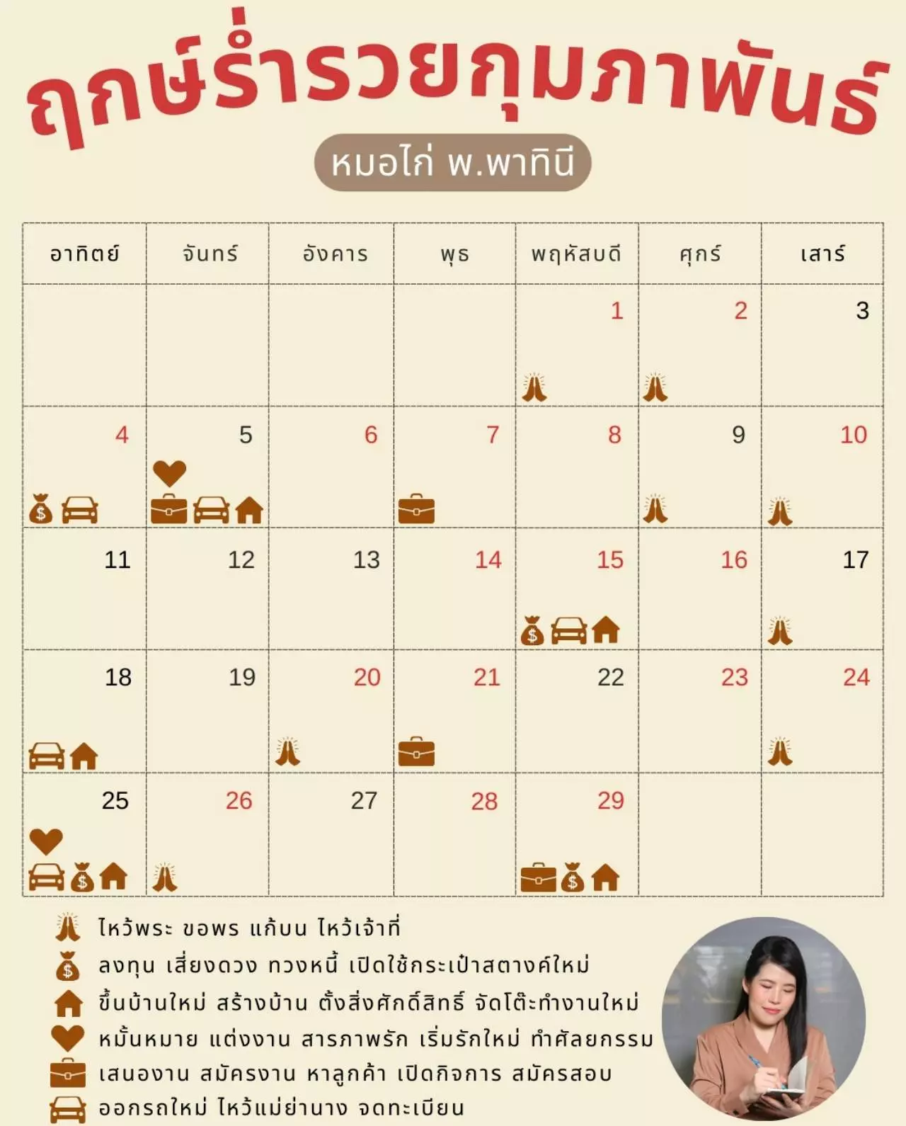 ที่มา : ฤกษ์ร่ำรวย เดือน ก.พ. 67 ไหว้พระ แก้บน เปิดธุรกิจ เปลี่ยนกระเป๋า-หมอไก่ (thairath.co.th)
