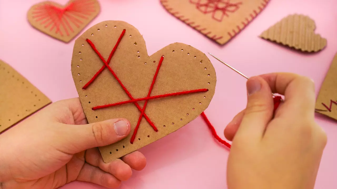 อีกหนึ่งไอเดียการ์ดรักๆ คือ การเพิ่มลูกเล่นด้วยการทำหัวใจถัก เริ่มแรกให้เตรียมกระดาษแข็งรูปทรงหัวใจ เจาะรูเล็กๆ พอให้เข็มร้อยเข้าไปได้ จากนั้นให้เริ่มถักไหมพรมตามรูที่เจาะไว้ จะเว้นตรงกลางสำหรับเขียนข้อความ หรือจะถักเพียงบริเวณขอบก็ได้เช่นกัน เพียงเท่านี้ก็จะได้การ์ดวาเลนไทน์ส่งให้คนพิเศษแล้ว