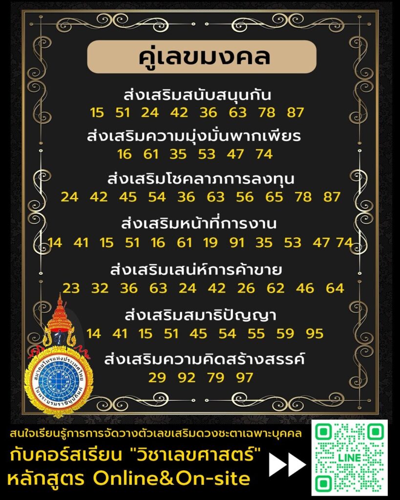 สมาคมโหรแห่งประเทศไทยฯ ได้เผยแพร่กลุ่ม “คู่เลขมงคล” ที่ช่วยส่งเสริมในด้านต่างๆ ตามหลักเลขศาสตร์ ดังเช่น