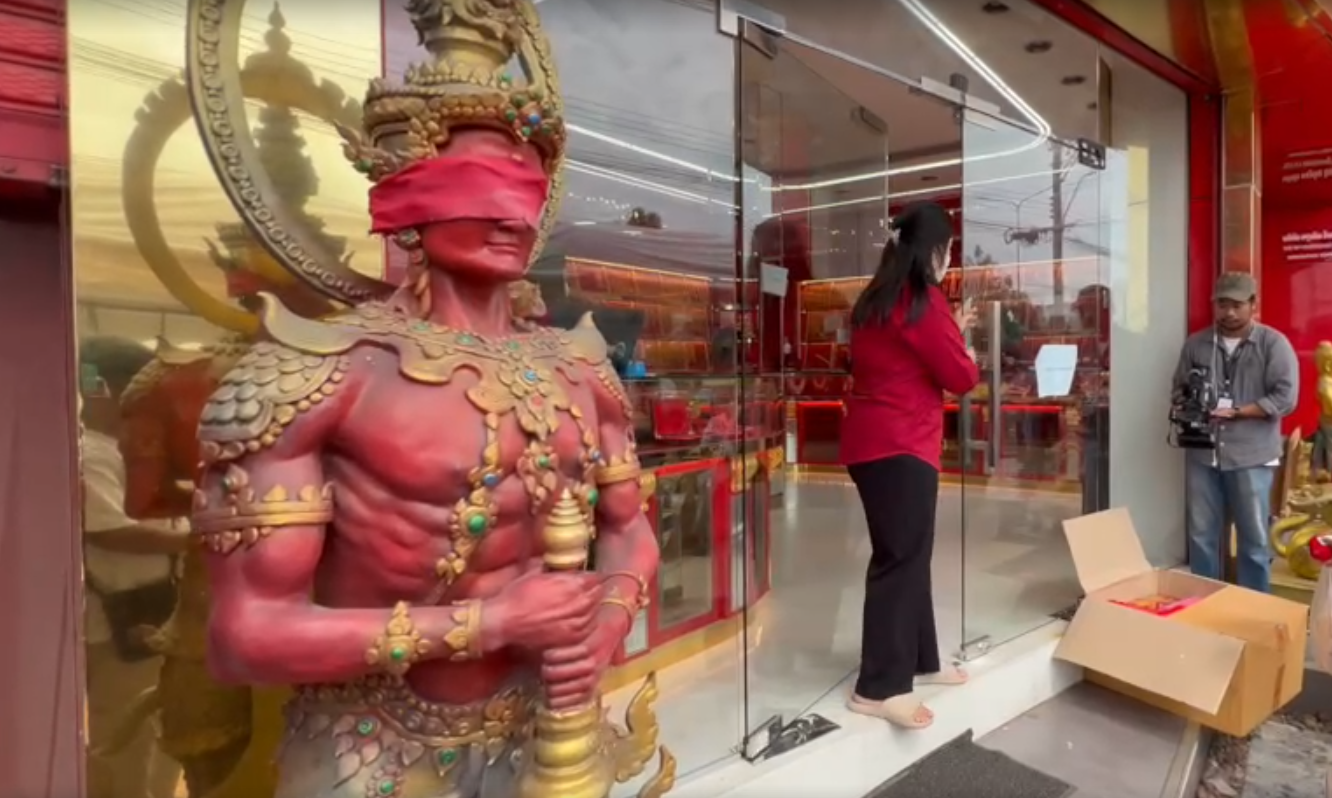 เปิดความเชื่อ เผยสาเหตุ ทำไมท้าวเวสสุวรรณ หน้าร้านทองแม่ตั๊ก ถึงต้องปิดตาด้วยผ้าแดง