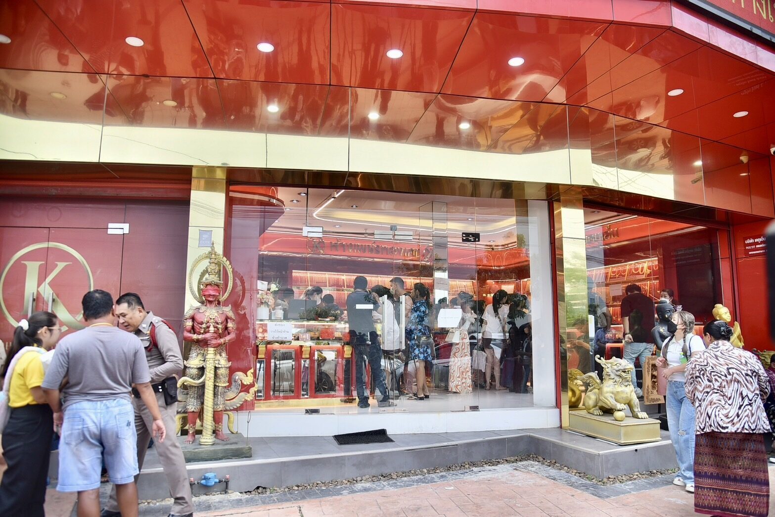 สำหรับความคืบหน้า วันที่ 25 ส.ค.67 ผู้สื่อข่าวรายงานว่า สำหรับบริเวณหน้าร้านทองคำของแม่ตั๊ก นอกจากมีลูกค้าที่นำทองคำที่ซื้อไปมาเข้าแถวรอคืนทองคำแล้ว พบว่าบริเวณหน้าร้านยังมีรูปปั้นท้าวเวสสุวรรณองค์สีแดง ยืนถือกระบอกอยู่บริเวณประตูทางเข้าร้านทองแม่ตั๊ก