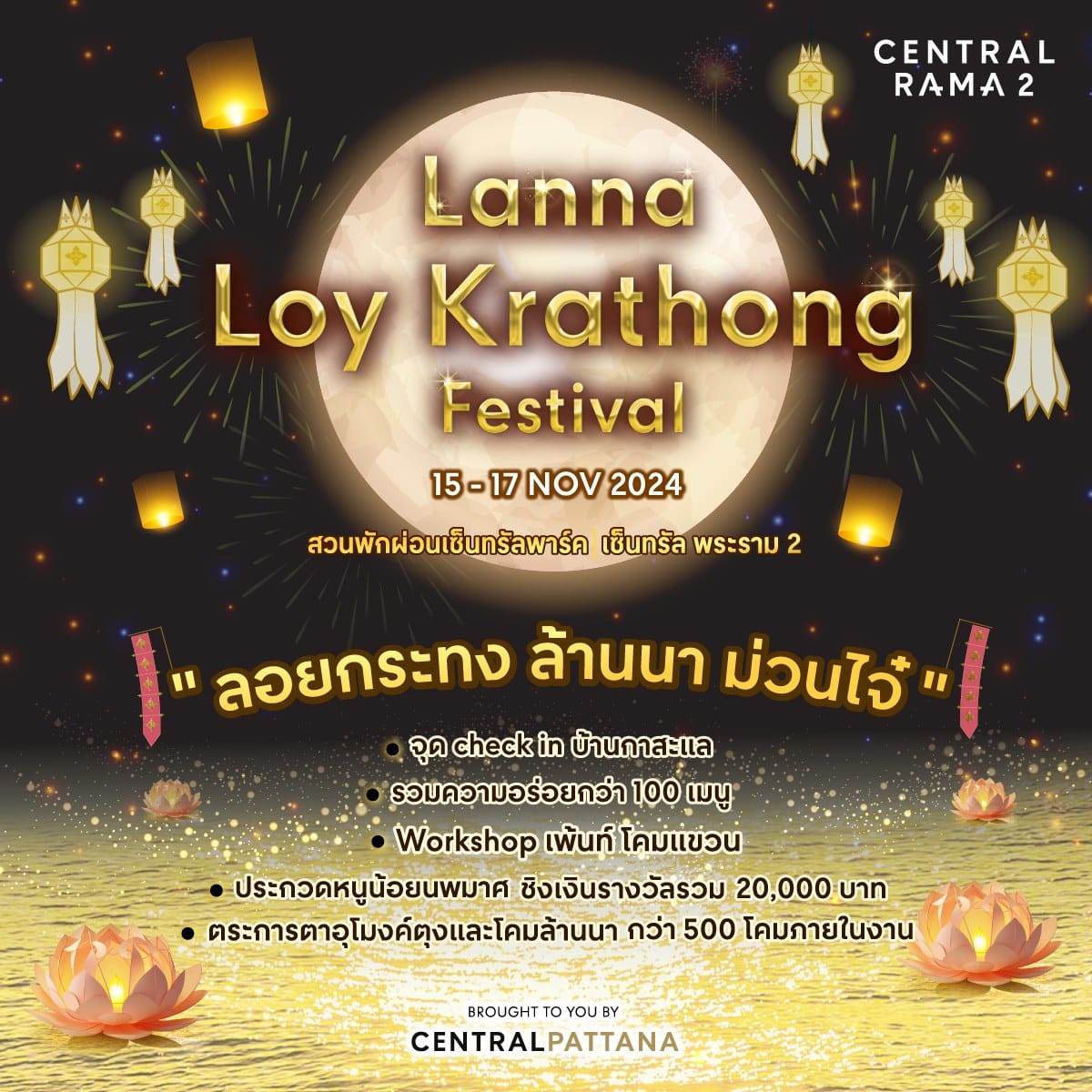 งาน Lanna’s Loy Krathong Festival ที่เซ็นทรัล พระราม 2 บรรยากาศงานลอยกระทงในธีมล้านนาแสนอลังการ ตกแต่งด้วยโคมล้านนากว่า 500 โคม พร้อมสนุกสนานกับการถ่ายรูปที่จุด Check-in บ้านกาสะแล กินดื่มกับอาหาร Street Food จากร้านดังที่ขนมาให้เลือกกว่า 100 เมนู! มินิคอนเสิร์ตและกิจกรรมเพ้นท์โคมแขวนแบบล้านนาที่จะสร้างความเพลิดเพลินให้คุณตลอดงาน นอกจากนี้ มีการประกวดหนูน้อยนพมาศชิงเงินรางวัลรวมกว่า 20,000 บาท จัดตั้งแต่วันที่ 15-17 พฤศจิกายน 2567 ที่สวนเซ็นทรัลพาร์ค พระราม 2