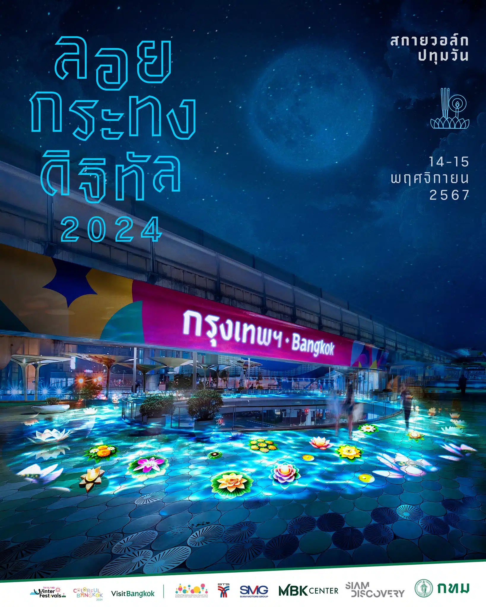 งานลอยกระทงดิจิทัล 2024 ณ Skywalk สี่แยกปทุมวัน จะมีการใช้เทคโนโลยี Projection Mapping เพื่อฉายภาพกระทงบนจอขนาดใหญ่ตั้งแต่เวลา กทม. ร่วมกับบริษัท ระบบขนส่งมวลชนกรุงเทพ จำกัด (มหาชน) หรือ BTSC บริษัท สยามพิวรรธน์ จำกัด บริษัท สยามกลการ จำกัด และบริษัท เอ็ม บี เค จำกัด (มหาชน) จัดงานลอยกระทงดิจิทัล 2024 ระหว่างวันที่ 14 – 15 พ.ย. 67 เวลา 18.00 – 23.00 น. ณ Skywalk สี่แยกปทุมวันวันที่จัดงาน: ในวันที่ 14-15 พฤศจิกายน 2567