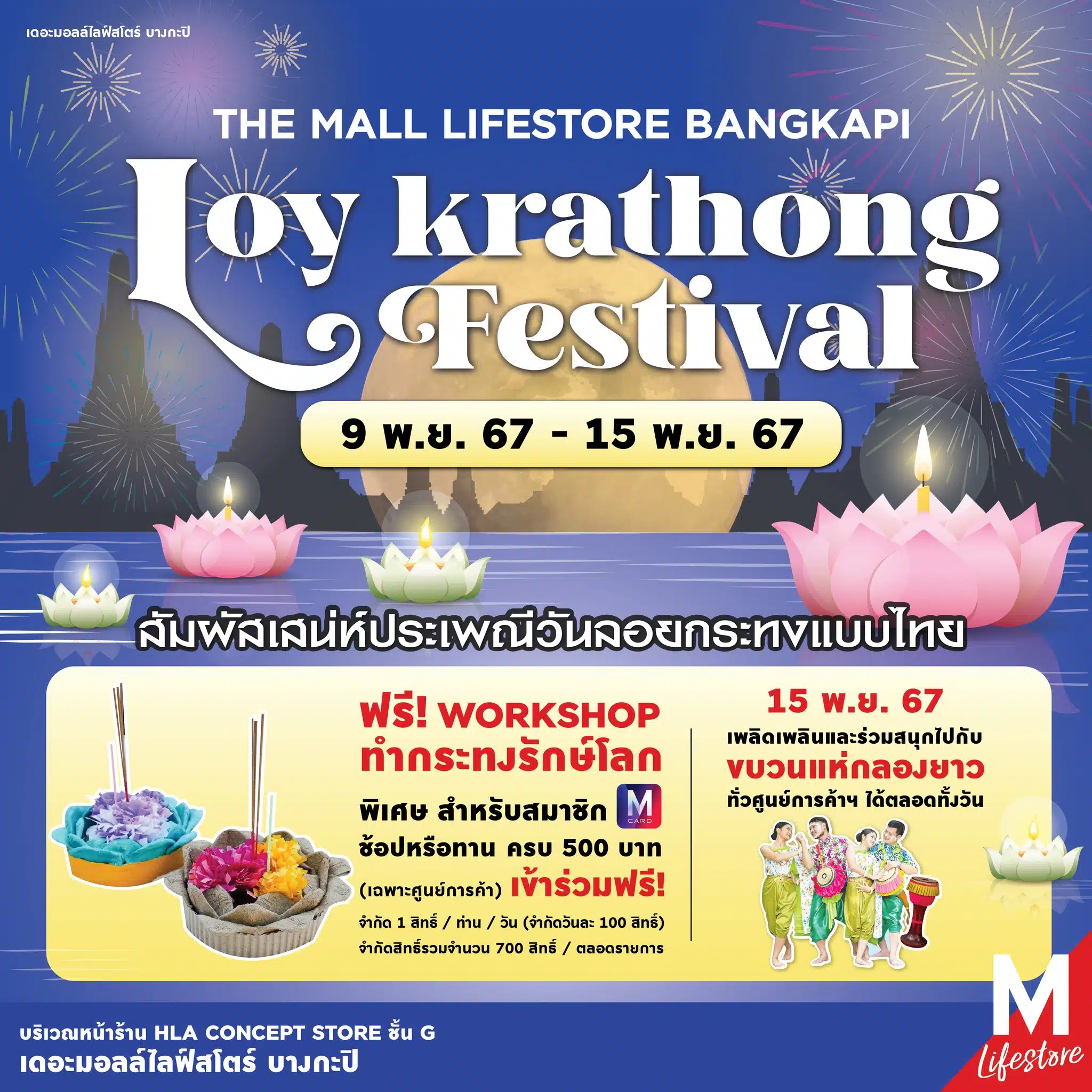 เดอะมอลล์ไลฟ์สโตร์ บางกะปิ ชวนคุณร่วมสัมผัสเสน่ห์ไทย ๆ ในงานลอยกระทงสุดพิเศษ พร้อมส่งต่อความใส่ใจสิ่งแวดล้อมกับกิจกรรม Workshop ทำกระทงรักษ์โลก ฟรี ทั้งนี้ สำหรับสมาชิก MCARD ที่ช้อปหรือทานครบ 500 บาทในศูนย์การค้า (จำกัด 1 สิทธิ์/ท่าน/วัน และรวม 700 สิทธิ์ตลอดรายการ) เริ่มสนุกกันได้ตั้งแต่วันที่ 9 – 15 พฤศจิกายน 2567 งานนี้ทั้งสนุก ทั้งได้ช่วยลดขยะพลาสติกในเทศกาลลอยกระทงปีนี้ ไฮไลต์พิเศษในวันที่ 15 พ.ย. 2567 มีขบวนแห่กลองยาว ที่จะเดินสร้างสีสันและความสนุกทั่วศูนย์การค้า ตลอดทั้งวัน บริเวณหน้าร้าน HLA CONCEPT STORE ชั้น G เดอะมอลล์ไลฟ์สโตร์ บางกะปิ