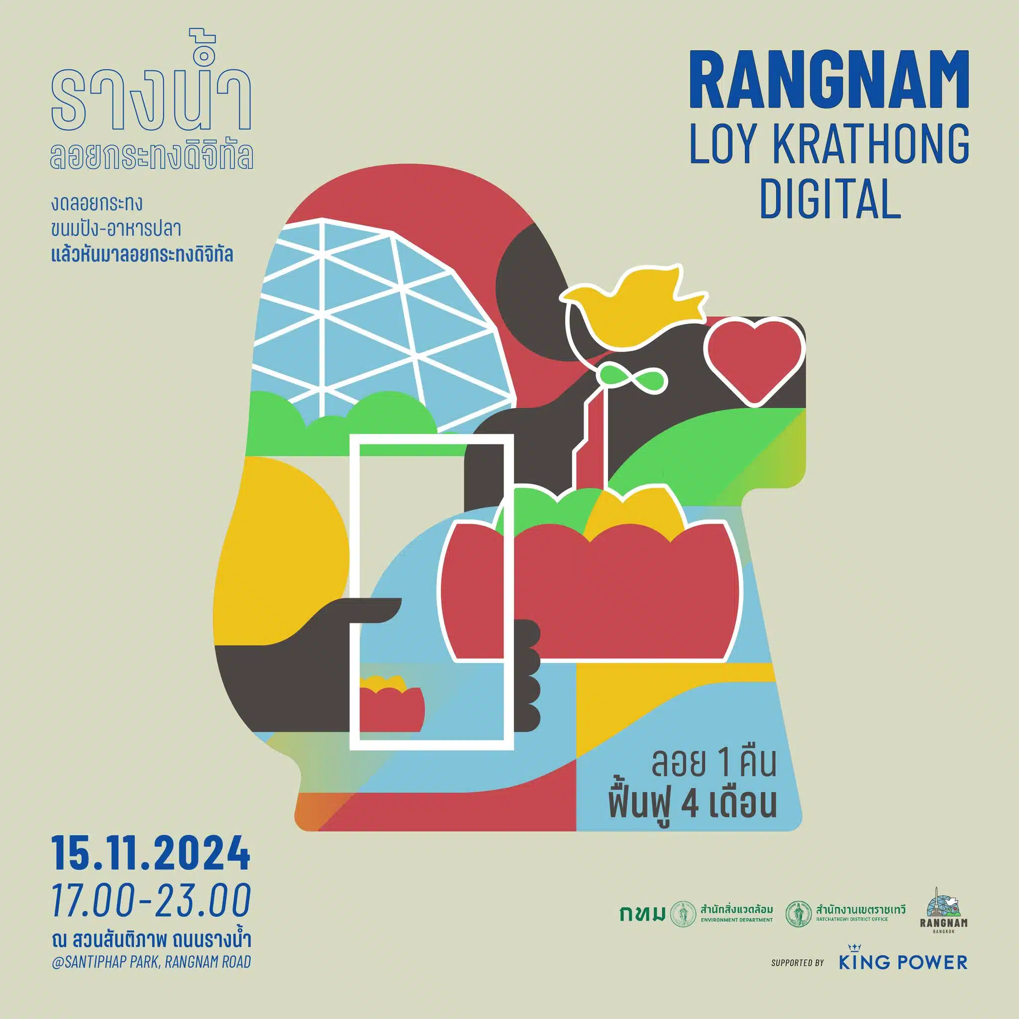 งาน Rangnam Loy Krathong Digital จัดขึ้นโดย สสล. ร่วมกับ คิงเพาเวอร์ จัดในวันที่ 15 พ.ย. 67 เวลา 17.00 น. ณ สวนสันติภาพ และบริเวณสระน้ำหน้าคราวน์ เอเทรียม ณ คิง เพาเวอร์ รางน้ำ โดยรณรงค์ลดการใช้กระทงที่ทำจากขนมปังและโฟม