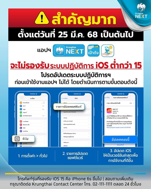 เพื่อยกระดับความปลอดภัยต่อการใช้โมบาย แบงก์กิ้ง ตั้งแต่เดือนมีนาคม 2568 เป็นต้นไป แอปฯ Krungthai NEXT เป๋าตัง และ ถุงเงิน จะไม่รองรับระบบปฏิบัติการ iOS ต่ำกว่าเวอร์ชัน 15