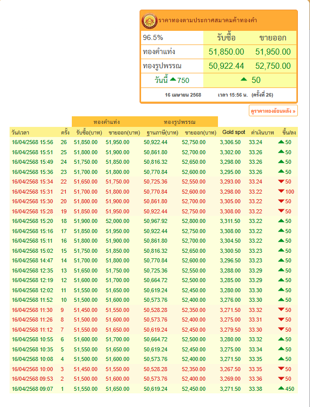 เมื่อวันที่ 16 เมษายน ผู้สื่อข่าวรายงานภาวะการซื้อขายทองคำ ประจำวันนี้ (16เม.ย.) ว่า ราคาทองคำวันนี้หลังเปิดซื้อขายก็มีการปรับขึ้นทำสถิติใหม่ทันที โดยราคาทองประกาศครั้งที่ 1 (เปิดตลาด) เมื่อเวลา 09.07 น. พุ่งขึ้นแรง 450 บาท แตะระดับสูงสุดเป็นประวัติการณ์ครั้งใหม่ของทองคำในประเทศบริเวณ 51,650 บาท (ทองคำแท่ง) หลังจากที่เมื่อวาน(อังคาร) มีการประกาศราคาทองทั้งหมด 4 ครั้ง รวมปรับตัวเพิ่มขึ้น 100 บาท