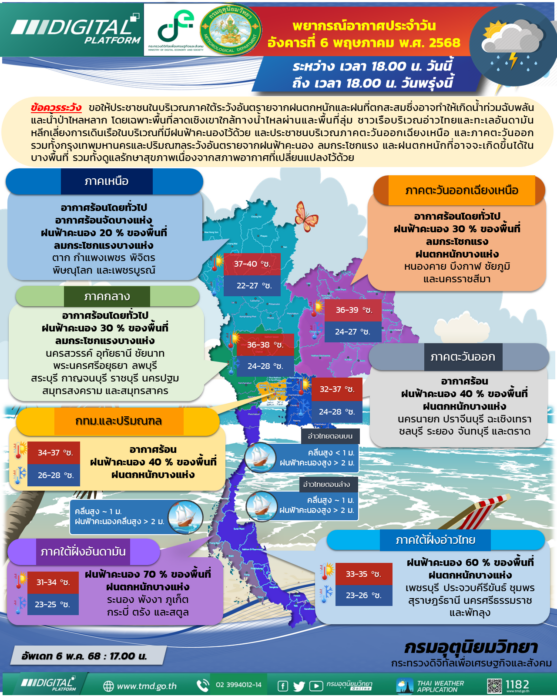 วันที่ 6 พ.ค.2568 กรมอุตุนิยมวิทยา พยากรณ์อากาศ 24 ชั่วโมงข้างหน้า ภาคใต้ยังคงมีฝนตกหนักบางแห่ง ขอให้ประชาชนในบริเวณดังกล่าวระวังอันตรายจากฝนตกหนักและฝนที่ตกสะสมซึ่งอาจทำให้เกิดน้ำท่วมฉับพลันและน้ำป่าไหลหลาก โดยเฉพาะพื้นที่ลาดเชิงเขาใกล้ทางน้ำไหลผ่านและพื้นที่ลุ่ม