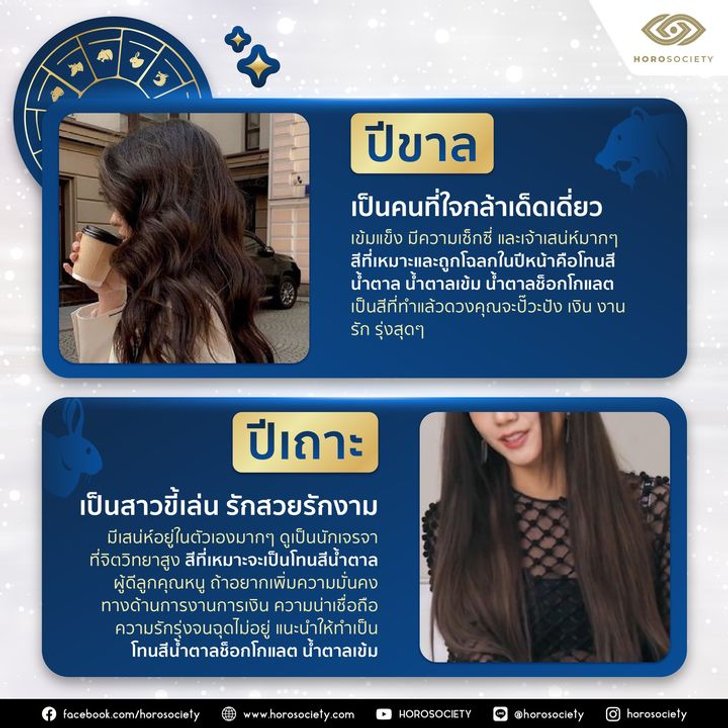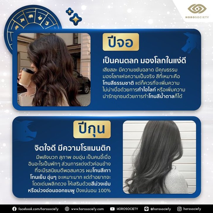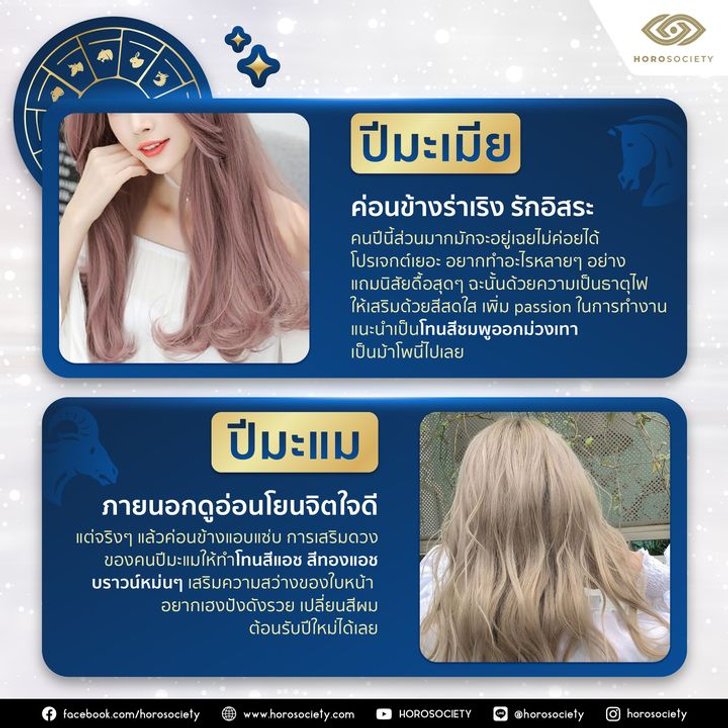 ภายนอกดูอ่อนโยน จิตใจดี แต่จริง ๆ แล้วค่อนข้างแอบแซ่บ การเสริมดวงของคนปีมะแมให้ทำโทนสีแอช สีทองแอชบราวน์หม่น ๆ จะเสริมความสว่างของใบหน้าได้ อยากเฮงปังดังรวย เปลี่ยนสีผมต้อนรับปีใหม่ได้เลย