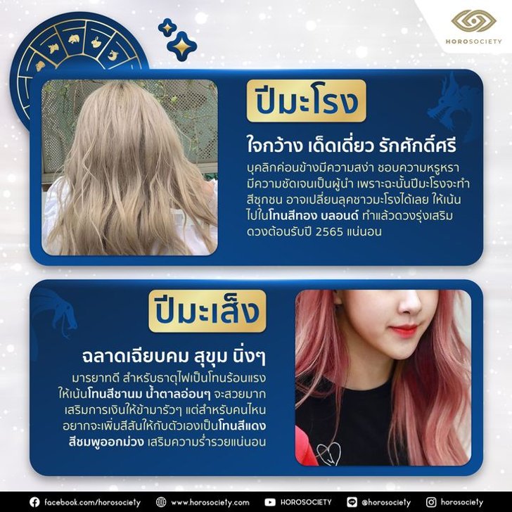 ใจกว้าง เด็ดเดี่ยว รักศักดิ์ศรี บุคลิกค่อนข้างมีความสง่า ชอบความหรูหรา มีความชัดเจน เป็นผู้นำ เพราะฉะนั้นหากจะทำสีซุกซน อาจเปลี่ยนลุคชาวมะโรงได้เลย ให้เน้นไปโทนสีทอง บลอนด์ ทำแล้วดวงรุ่ง เสริมดวงต้อนรับปี 2565 แน่นอน
