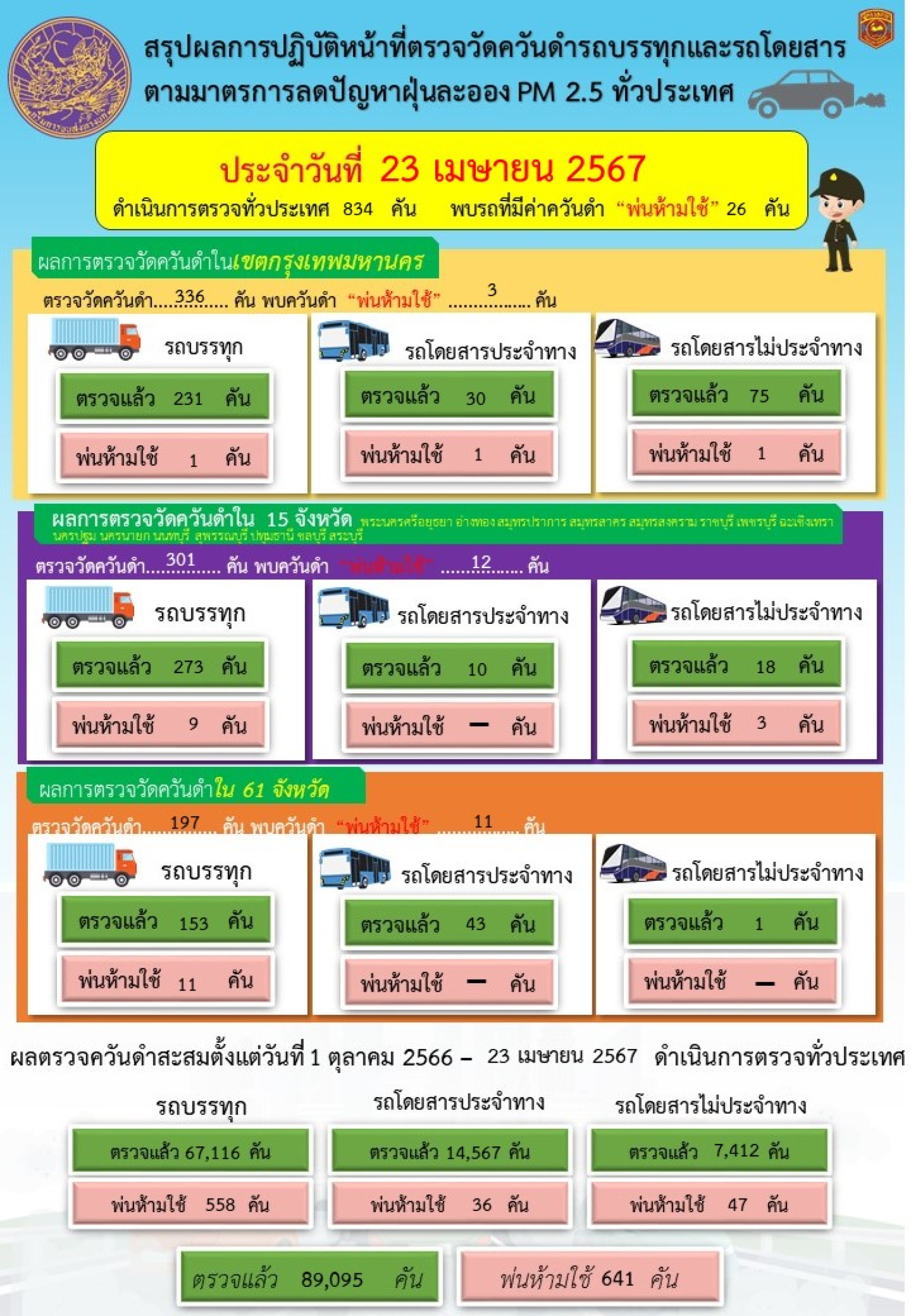 วันที่ (23 เมษายน 2567) นายจิรุตม์ วิศาลจิตร อธิบดีกรมการขนส่งทางบก เผยผลการดำเนินการตรวจควันดำรถบรรทุกและรถโดยสารทั่วประเทศ ซึ่งเป็นการดำเนินการตามนโยบายของกระทรวงคมนาคม เพื่อป้องกันและแก้ไขปัญหาฝุ่นละอองขนาดเล็ก PM 2.5 โดยผลการตรวจวัดควันดำวันที่ 23 เมษายน 2567 มีผลการตรวจวัดควันดำรถโดยสารและรถบรรทุกทั่วประเทศ จำนวน 834 คัน พบรถที่มีค่าควันดำเกินเกณฑ์มาตรฐานที่ราชการกำหนด จำนวน 26 คัน ส่งผลให้ตั้งแต่วันที่ 1 ตุลาคม 2566 – 23 เมษายน 2567 ดำเนินการตรวจควันดำรถทั้งสิ้น 89,095 คัน พ่นห้ามใช้แล้วจำนวน 641 คัน