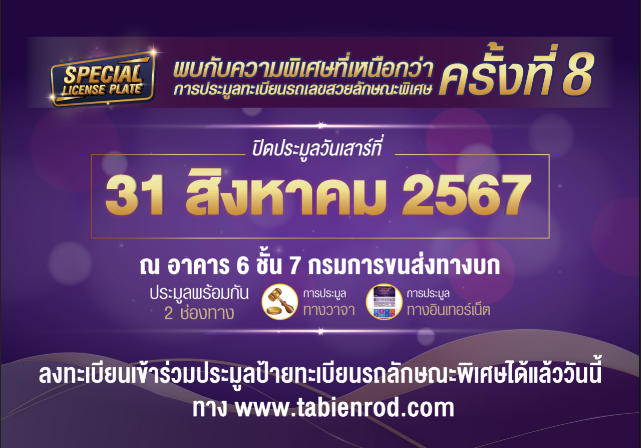 กรมการขนส่งทางบก เชิญชวนผู้สนใจเข้าร่วมการประมูลหมายเลขทะเบียนรถเลขสวยลักษณะพิเศษ ครั้งที่ 8 ในวันที่ 31 สิงหาคม 2567 ณ กรมการขนส่งทางบก โดยสามารถลงทะเบียนเข้าร่วมประ มูลได้แล้ววันนี้ ที่เวบไซท์ www.tabienrod.com
