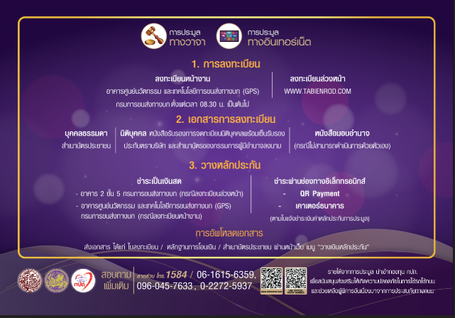 การประมูลหมายเลขทะเบียนรถที่มีลักษณะพิเศษเพิ่มเติมได้ทาง www.tabienrod.com หรือสำนักงานกองทุนเพื่อความปลอดภัยในการใช้รถใช้ถนน โทร. 0-2272-5937 หรือสายด่วนกรมการขนส่งทางบก โทร. 1584 หรือ 0-2271-8888