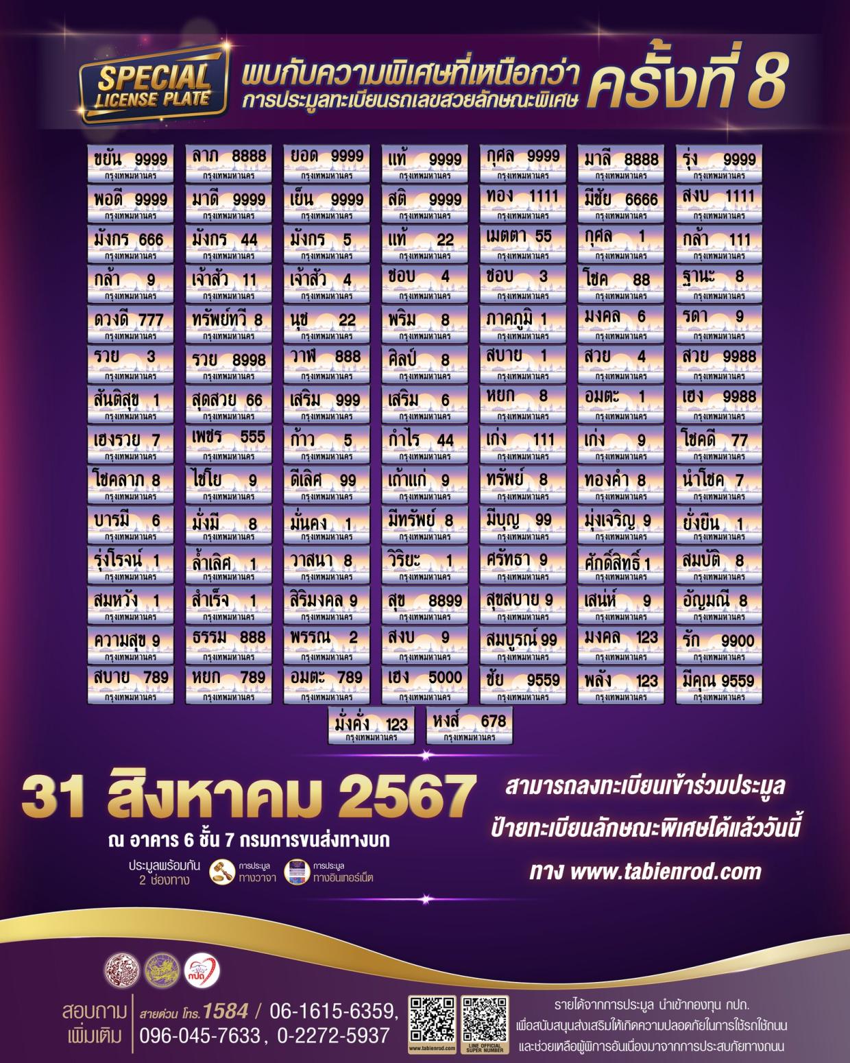 จิรุตม์ วิศาลจิตร อธิบดีกรมการขนส่งทางบก กล่าวว่า กรมการขนส่งทางบก โดยกองทุนเพื่อความปลอดภัยในการใช้รถใช้ถนน (กปถ.) ประชาสัมพันธ์เชิญชวนผู้สนใจเข้าร่วมการประมูลหมายเลขทะ เบียนรถที่มีลักษณะพิเศษ สำหรับรถยนต์นั่งส่วนบุคคลไม่เกิน 7 คน ครั้งที่ 8 ในวันเสาร์ที่ 31 สิงหาคม 2567 ตั้งแต่เวลา 10.00 น. ณ อาคาร 6 ชั้น 7 กรมการขนส่งทางบก การจัดประมูลหมายเลขทะ เบียนรถเลขสวยที่มีลักษณะพิเศษครั้งนี้มาในคอนเซพท์ ความพิเศษเหนือระดับสำหรับ “คนพิเศษ” โดยจะมีหมายเลขทะเบียนรถฯ ออกประมูล รวมทั้งสิ้น 100 หมายเลข แบ่งออกเป็น 4 กลุ่ม ได้แก่กลุ่ม Super Premium ลักษณะเป็นเลข 8 และ 9 4 ตัวเหมือน (8888, 9999) ราคาเริ่มต้นการประมูล 1,500,000 บาท กลุ่ม Premium ลักษณะเป็นตัวเลข 4 ตัวเหมือน (1111, 2222, 3333, 4444, 5555, 6666, 7777) ราคาเริ่มต้นการประมูล 1,000,000 บาท