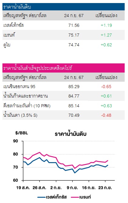 โดยราคาน้ำมันดิบเวสต์เทกซัสซื้อขายเมื่อ 24 ก.ย. 2567 อยู่ที่ 71.56 เหรียญสหรัฐต่อบาร์เรล เพิ่มขึ้น +1.19 เหรียญสหรัฐ และราคาน้ำมันดิบเบรนต์อยู่ที่ 75.17 เหรียญสหรัฐต่อบาร์เรล เพิ่มขึ้น +1.27 เหรียญสหรัฐต่อบาร์เรล